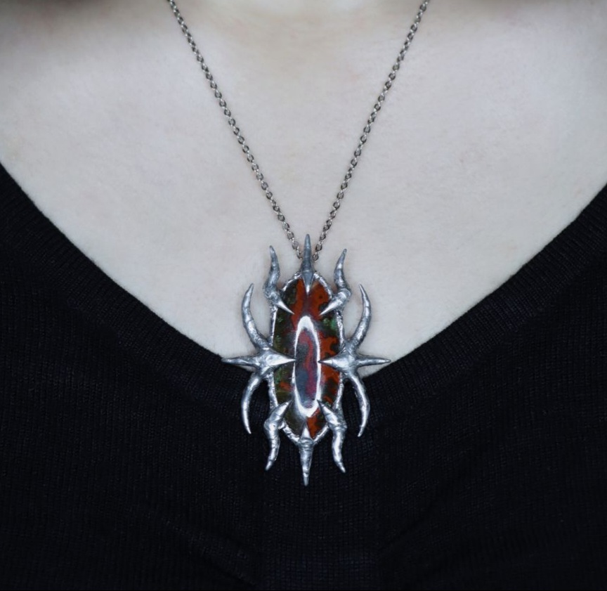 رود خون اثری یگانه و دستساز است؛ خلاقهای هنری که بهصورت تکنسخه و با صرف زمان، اندیشه و دستان توانای هنرمند شکل گرفته است. این اثر با الهام از رنگ و خطوط درونی سنگ سیم آگات معدنی طراحی شده و نام آن نیز برآمده از روایت همین سنگ و جهان درونیاش است. رود خون بیش از یک زیور است؛ تفسیر و بازتابی از نگاه هنرمند به فرم، طبیعت و معنا.